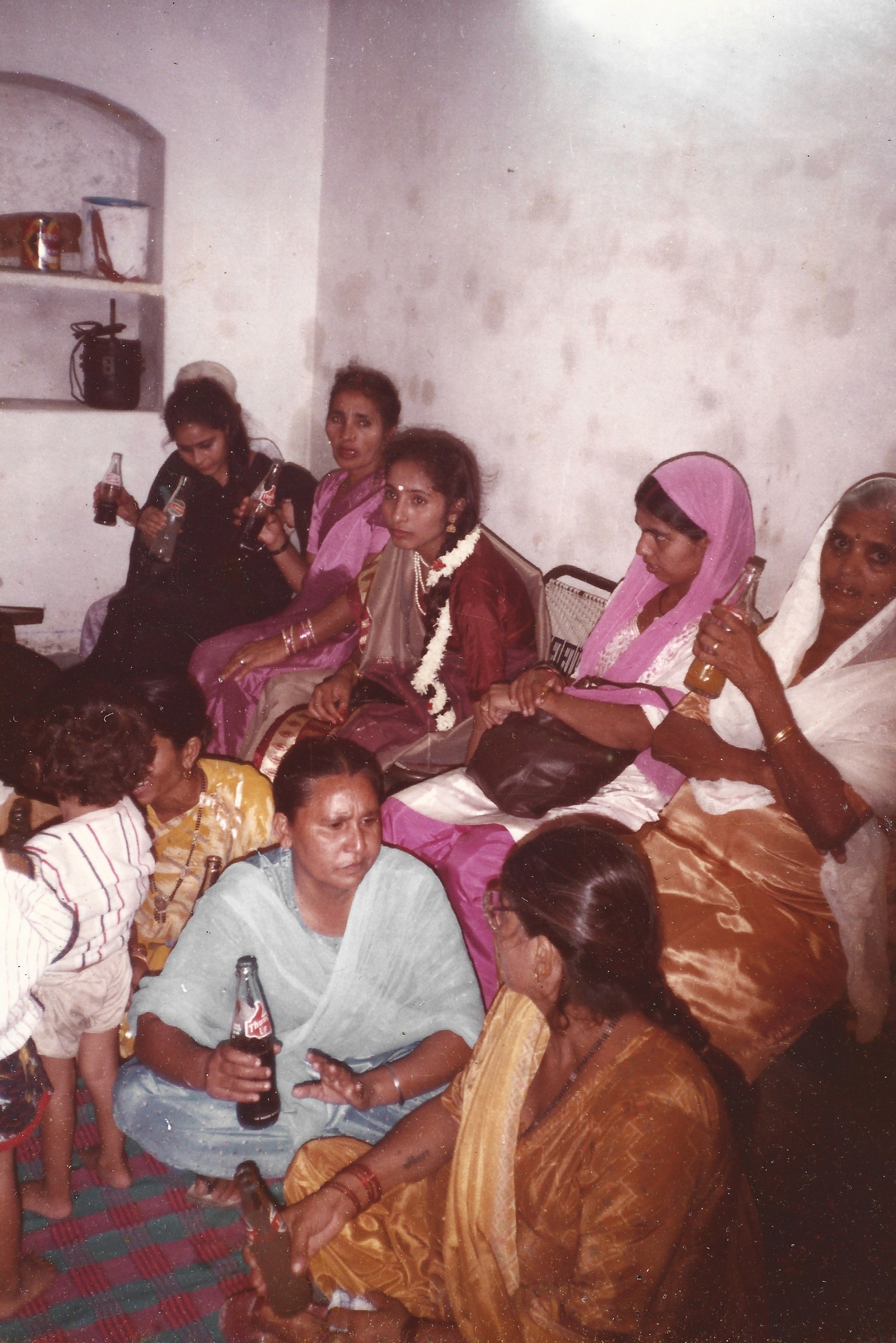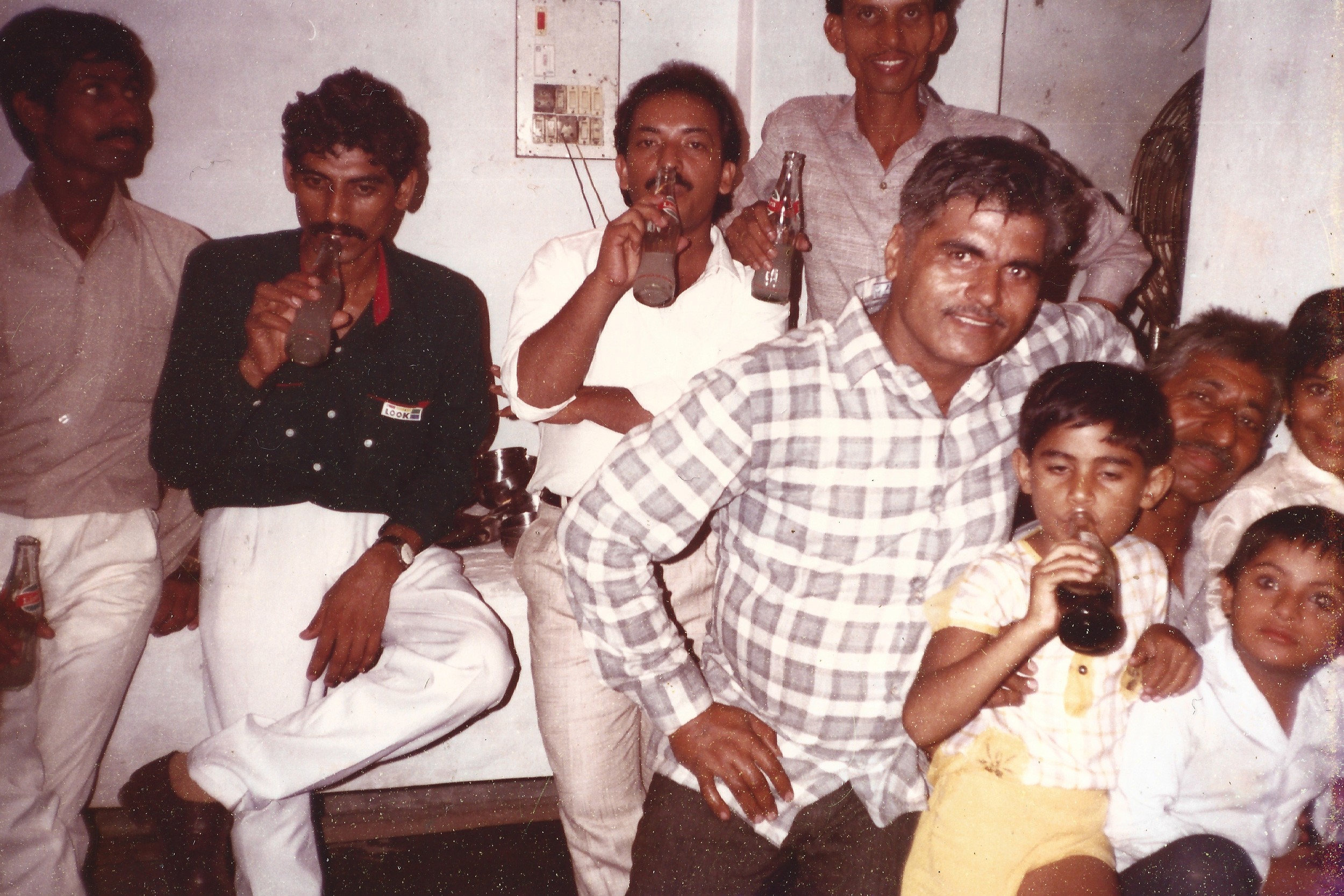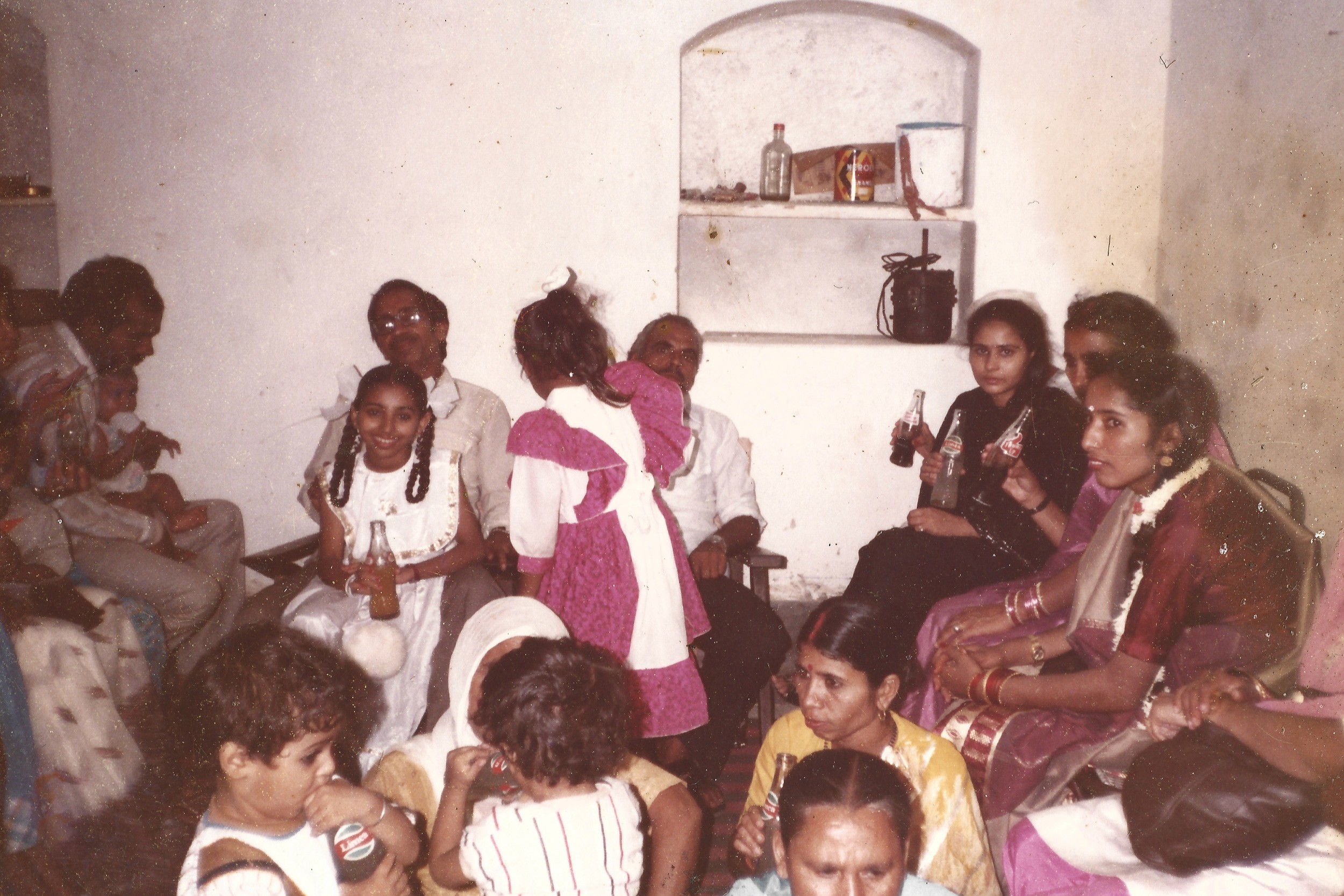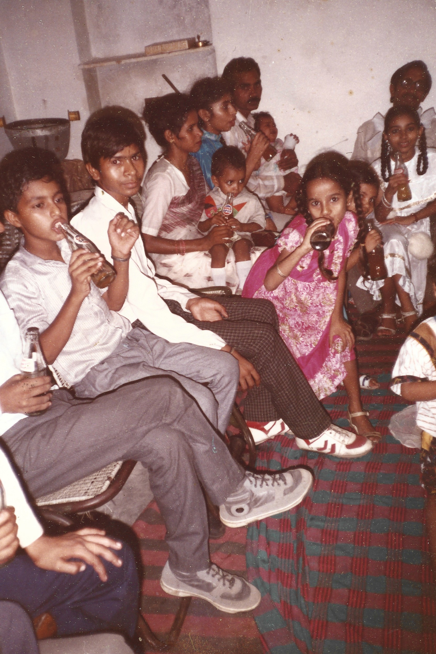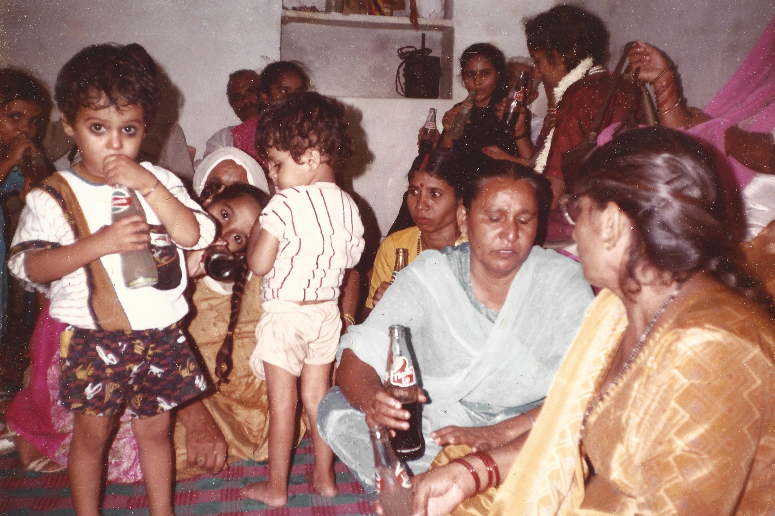 A group of relatives from different generations, roughly thirty to forty people can be seen accommodated in a small room, which seems to be the living area of my late grandparents’ house. In a set of photographs from my family albums, some are sitting on a divan, while others are perched on chairs lined against the walls that have now ceased to form any enclosure. They overlook others who are scooched down on a striped carpet spread out in the center of the room. Some are leaning against the walls and others are accommodated with those nearby. They can be seen, in these photographs, partaking in moments of leisure and laughter, conversations and caresses as if sharing an age-old secret of the family. Held together on a foreign land with the broken thread of the family line fifty years after the Partition, reforming, resuscitating, rebuilding—which perhaps is more evident to them, unlike to the viewer of these photographs. Adorned in vibrant clothing, children and adults alike hold curvaceous bottles of glass: Gold Spot, Thums Up and Limca scripted on them, soon to be succumbed under the infamous umbrella of the brand Coca-Cola. The zingy logos visible through their grips as symbols of their survival and as objects of their status shine. One for each member of the family, relishing the refreshment of the special evening—my aunt’s engagement ceremony.